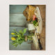 Esta surpreendente quebra-cabeça de quebra-cabeça apresenta tulipas amarelas, queijo, pão e leite em um fundo rústico #comida #tulips #jigsawpuzzle #presentes #stockstuffers