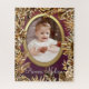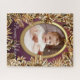 Quadro de ouro floral brilhante com fundo roxo e texto para personalizar.