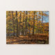Este quebra-cabeça cênico mostra uma floresta com folhagem de outono em cores quentes.
