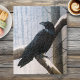 Raven sentado em um galho de árvore. Inverno e árvores ao redor com neve caindo.