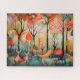 Uma pintura colorida de árvores e flores, no estilo de paisagens brancas, criaturas fantásticas e imaginativas, formas distintas, madeira, campos coloridos musicais, com grande formato de canvas.