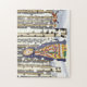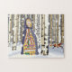 Experimente este quebra-cabeça de inverno colorido com uma garota de roupa e capa colorida de camponês, parada em uma madeira de pássaro na neve.