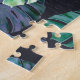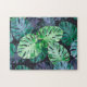 Folhas de monstera tropical de coloração aquosa colorida sobre fundo azul escuro.