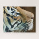 Quebra-cabeça de quebra-cabeça divertida com um perfil bem próximo de um belo rosto de tigre.