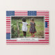 Patriótica USA AMERICAN Flag quebra-cabeça com TEXTO PERSONALIZÁVEL. Esta é uma quebra-cabeça de serra-de-vidro FOTO na moda patriótica AMÉRICA, mostrando uma FOTO PERSONALIZÁVEL no centro com uma borda interna fina e uma borda externa mais espessa. Você pode substituir a foto por uma em forma semelhante, da sua escolha, e adicionar sua própria legenda fotográfica. A bandeira dos ESTADOS UNIDOS está no fundo em um padrão de títulos. Isto constituiria um presente de guarda de excelentes para os aniversários e o Natal, e para qualquer ocasião especial ao longo do ano.
