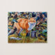 De uma pintura a óleo original por Brenda Thour de uma raposa vermelha macia bonita grande com um fundo das folhas. Copyright 2004.