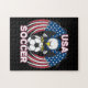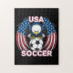 A vista feroz e a águia americana patriótica agarram uma bola de futebol com suas garras no presente do futebol dos EUA! Estrelas brancas e asas azuis e vermelhas, muito patriótico e desportivo!