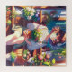 Garota de anime fofa sentada nos seus degraus de frente num dia de verão segurando uma planta. Quebra-cabeça para quem ama plantas e animais.