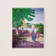 Garoto, carregando e vara de pesca, caminhando na estrada de terra em direção ao lago. Árvores verdes lançam sombras escuras no caminho, menino está à luz do sol com seu cabelo louro captando luz solar. O texto "Indo' Pishin' " está "arranhado" na parte inferior da imagem. Pintura d'água original de John A. Muir.