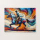 Este desenho abstrato moderno apresenta um vaqueiro cavalgando seu cavalo em uma espiral de cores.