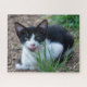 Gato de smoking branco e preto, com a língua a ficar escondida atrás de um grupo de grama.