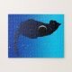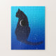 Quebra-cabeça numa silhueta de um elegante gato sentado, apadrinhado com um céu estrelado e lua crescente sobre um fundo azul e estrelado à noite