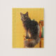 Gato negro sentado sobre a mesa com manchas de fios de várias cores. Fundo em amarelo.