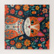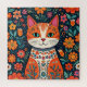 Gato de arte popular laranja e azul com olhos azuis e uma arte ai floral.