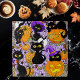 Gatos pretos bonitos entre abóboras, doces de halloween, morcegos, vassoura, estrelas, milho doce, bolota, lua de cheio, folhas de outono e um fantasma cortado todos colocados num pano de fundo roxo leve
