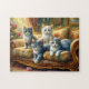 Este quebra-cabeça de quebra-cabeça apresenta 4 felinos fazeres confortáveis no sofá da sala - uma cena bonita em um olhar antigo. Para todos os amantes de gatos! Uma pequena ideia bonito para muitas ocasiões.