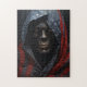 A imagem retrata um retrato aproximado de uma pessoa que se assemelha a um fantasma ou zumbi com uma face escura, quase esquelética, coberta por uma rede de finas linhas de ouro. Seus olhos são largos e intensos, encarando diretamente o espectador. A figura é envolta num manto de capuz feito de uma bandeira americana envelhecida e apunhalada, com as listras vermelhas e brancas visíveis ao redor do pescoço e ombros. Imagem: um posto apocalíptico ou distopiano.