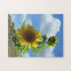 Girassóis com pétalas amarelas brilhantes, sobre uma colina marrom, céu azul e nuvens brancas lisas de fundo. Esta imagem vai iluminar qualquer humor.