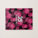 This pink and black girls' basketball jigsaw puzzle features a pattern of varied size hot pink basketballs that appear to fade into the black background - customize with basketball player's name and jersey number - by katz_d_zynes
