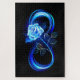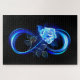 Luminous infinity symbol with glowing, beautiful, lushly blooming rose made of blue flames on black background.