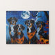 Libere o espírito assustador com esta design sombria do Dia das Bruxas apresentando um bando de cachorros sob um céu escuro e iluminado, cercado por morcegos voadores e abóboras brilhantes. Perfeito para aqueles que amam um toque de diversão terrível com seus amigos peludos!