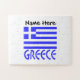 A bandeira grega e a palavra, ou o nome GRÉCIA em azul. A bandeira mostra faixas azuis e brancas com uma cruz azul e branca na área superior direita. Acima dele, adicione seu nome a um toque personalizado ou crie um dom personalizado de um quebra-cabeça de quebra-cabeça. Divertido para reuniões familiares, grupos viagem, e compartilhar seu amor e orgulho em sua herança, ancestralidade e cultura. Excelente para celebrar o Dia Oxi (Ohi ou Ochi, também).
