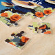 Grécia riviera num jogo de quebra-cabeça. Barcos no porto e um pequeno mercado no rio. Montanhas de grécia atrás. poster de viagens vintage.