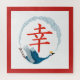 A ilustração colorida apresenta o centro de caligrafia japonês 'Felicidade' com fundo azul, fundo branco e borda vermelha.