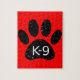 Um texto e impressão de pata de cão com estilo de desenho animado, com efeito de resmungão e ressonância aplicado à imagem. Quebra-cabeça personalizadas de serra-de-vidro com tema K9. Ideia do presente.