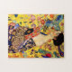 Quebra-cabeça com a pintura a óleo de Gustav Klimt Lady com ventilador (1918). Uma mulher vestindo um quimono azul segura um fã vermelho contra um fundo amarelo colorido de flores e pavões. Um presente de excelente para fãs de arte japonesa e europeia.