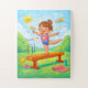 This cute gymnastics puzzle for kids features a happy young gymnast balancing on a beam in a colorful outdoor setting.