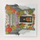 Um gato cinza bonito bate um cochilo na porta de uma casa de Halloween festivamente decorada.