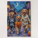 Adoráveis Retrievers de Ouro vestidos com fantasias lúcidas de Halloween baldes de abóbora carregar enquanto se trata ou se engana sob o céu iluminado. Este design festivo destaca o casaco ouro, os olhos amáveis e a personalidade amorosa da raça, capturando perfeitamente a atmosfera assustadora e divertida da noite de Halloween. Uma celebração alegre para amantes de cães e fãs de Halloween.