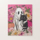 Este quebra-cabeça bonitinho de halloween apresenta um fantasma encantador abraçando um gato preto de olhos largos, rodeado por flores brancas, abóboras e morcegos fluttering — todos colocados contra um fundo rosa ousado. Este design fofo e esquisito combina vibrações da estação assustadora com charme de cottagecore e talento feminino, perfeito para quem ama o Halloween com um lado de flores e diversão.