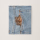 O hamster sírio de cabelos longos sai do bolso de trás dos jeans azuis de denim