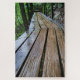 A carefully built wooden walkway winds through lush tropical forest. Light filters through leaves, illuminating the path ahead. The scene reflects harmony between human care and wild nature. Structured lines contrast softly with organic growth.