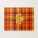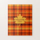 This difficult jigsaw puzzle is a tribute to fall. The design features a colorful fall plaid design with a fall leaf in the center. The words, "Welcome Fall" appear in the center of the leaf. This is a hard, but fun puzzle to put together in varying sizes. Copyright Kathy Henis