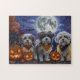 Libere o espírito assustador com esta design sombria do Dia das Bruxas apresentando um bando de cachorros sob um céu escuro e iluminado, cercado por morcegos voadores e abóboras brilhantes. Perfeito para aqueles que amam um toque de diversão terrível com seus amigos peludos!
