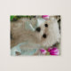 Características deste produto Hermes, um cão de filhote de cachorro maltês pequeno doce que está entre algumas tulipas bonitas do primavera.