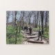 Esta quebra-cabeça de serra é uma foto que tirei enquanto caminhava no Cold Primavera Harbor, Nova Iorque. A foto mostra as costas de vários caminhantes explorando o caminho na minha frente. As sombras das árvores ao redor são visíveis no caminho. As árvores estão nuas de folhas desde o inverno.