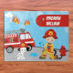 Tem um garotinho que sonha em ser bombeiro? Este quebra-cabeça de serra é perfeito! Quebra-cabeça tem um menino vestindo o chapéu de bombeiro e segurando uma mangueira de água pulverizada. Há também um cão Dalmaciano, um caminhão de bombeiros, um machado de incêndio e um hidrante de incêndio. Personalize a quebra-cabeça com o nome do seu filho e o monograma inicial.