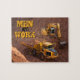 Esta legal quebra-cabeça apresenta uma fotografia espantosa de um trator amarelo e de um caminhão de lixo num local de construção com a mensagem personalizável "Men at Work". Fotografia criada pela fotógrafa Maria Jeffs, prêmio vencedora.