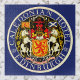 Ilustração vintage de pôster de viagem europeu ou etiqueta de bagagem do Hotel Caledonian, Edimburgo, Escócia, apresentando o brasão de armas real da Escócia. Um desenho circular com um leão vermelho simbolizando o Rei dos Escoceses, no topo do escudo está o elmo e o timbre. O leão usa a Coroa da Escócia e segura o Cetro e a Espada de Estado e os suportes são dois unicórnios coroados e acorrentados. Ao redor do escudo está o colar da Antiga e Nobilíssima Ordem do Cardo. Em Defens, Hotéis da British Transport.
