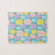 Quebra-cabeça de cabana de praia. Cascas costeiras, cor-de-rosa, amarela, azul e púrpura, listradas, sobre fundo azul lacrimogêneo - completas com pequenas gaivotas brancas.