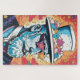 Este quebra-cabeça apresenta uma ilustração colorida de vetor de um traidor icônico macho com roupa elegante, cabelo e barba brancos, óculos de sol em forma de estrela e chapéu decorado com flores. Este é um quebra-cabeça desafiador e excelente para quebra-cabeças experientes.