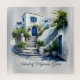 Imagem aquosa de uma cena da Ilha de Mykonos, Grécia. Um plano de fundo branco suave completa a configuração.
