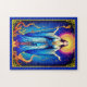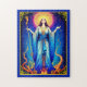 Quebra-cabeça no cartão de tarô "A Rainha das Terras". De pé, na região, em vestes azuis, radiantes sob um halo ouro, ela segura uma varinha, simbolizando poder e criatividade. Cercada por galhos e estrelas ferozes, ela exalta confiança, calor e força espiritual