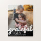 Faça uma bela quebra-cabeça de manutenção. Adicione sua foto favorita e personalize áreas de texto para torná-la especial e exclusiva para você ou como presente. Design apresenta um moderno script de blocos de cores preto e branco para a palavra grata.