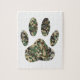 Um estilo de desenho animado de impressão de pata de cachorro de camo com efeito aflitivo aplicado à imagem. Quebra-cabeça de serra personalizadas. Ideia de presente para amantes de cães.