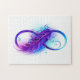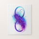 Símbolo infinito com uma bela pena pintada em cores roxas e azuis brilhantes sobre fundo branco.